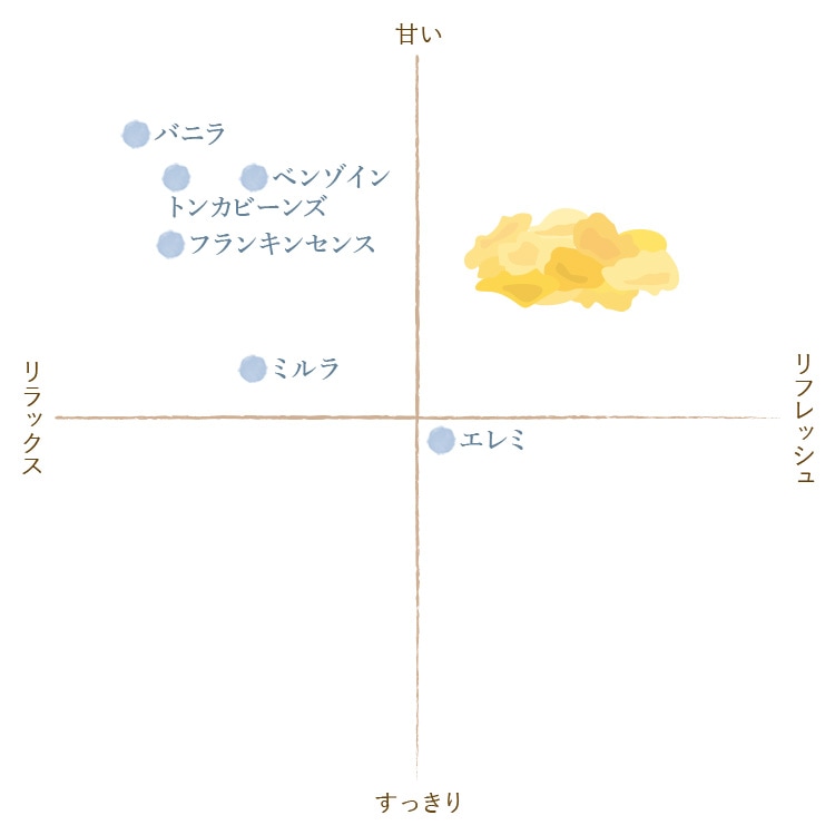 木の樹脂から抽出された精油のグループ。温かみのある重厚な香りが特徴です。 おすすめの利用シーン:気持ちを落ち着かせたい時に